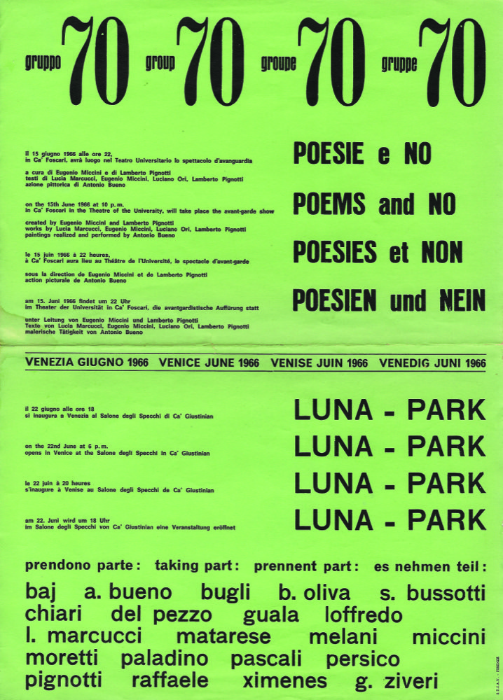 When, in 1968, Gruppo 70 dissolved, he took part in the activities of Tèchne and with Miccini and Ori in the International Group of Visual Poetry or Gruppo dei Nove, established in the early 1970s and supported by Studio Brescia. In 1972 the XXXVI Venice Biennale International Art Exhibition.