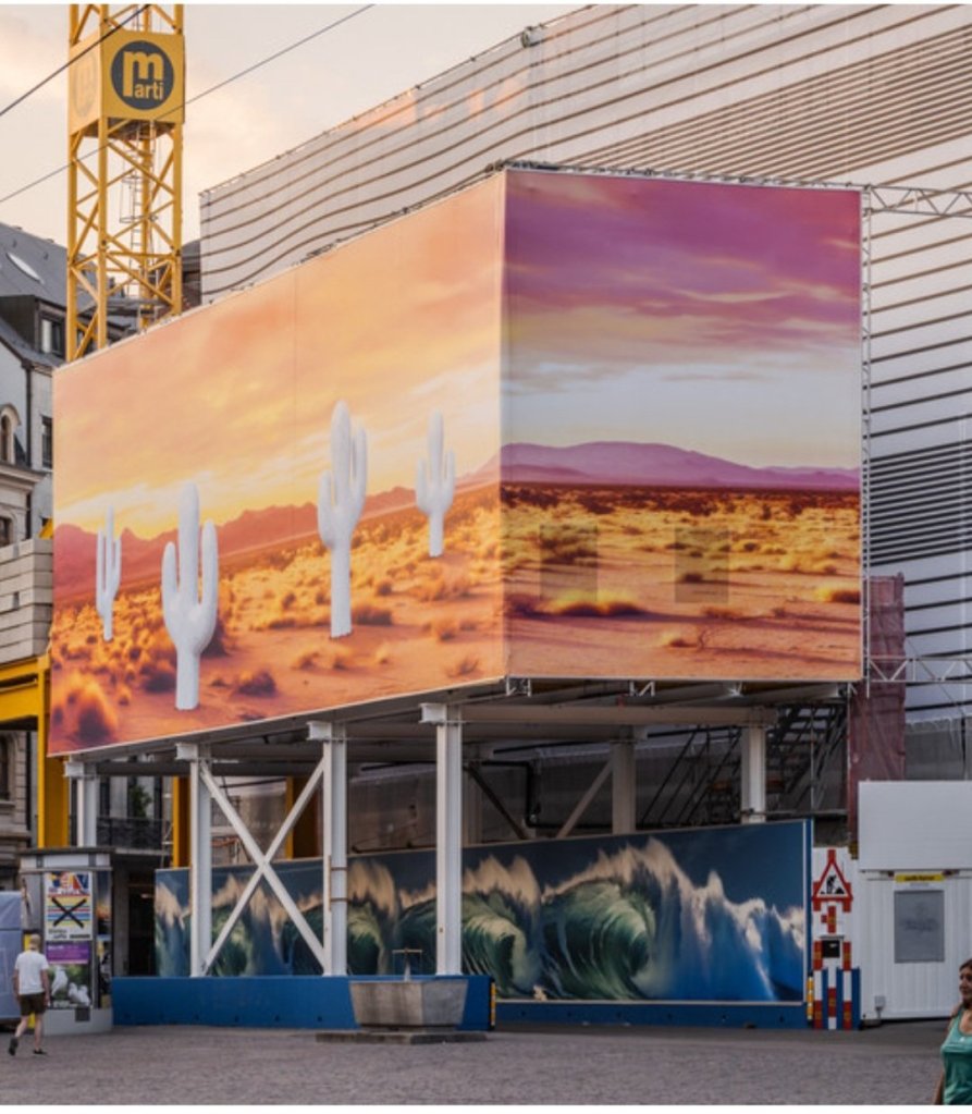 This summer, an addiction to the usual exhibition spaces, Swiss artist Claudia Comte will take-over and transform the facade of Basel’s historical department store Globus with a large-scale installation that offers passers-by a moment of contemplation in their daily routines. Waves, Cacti and Sunsets is the first iteration of the “Globus Public Art Project”.