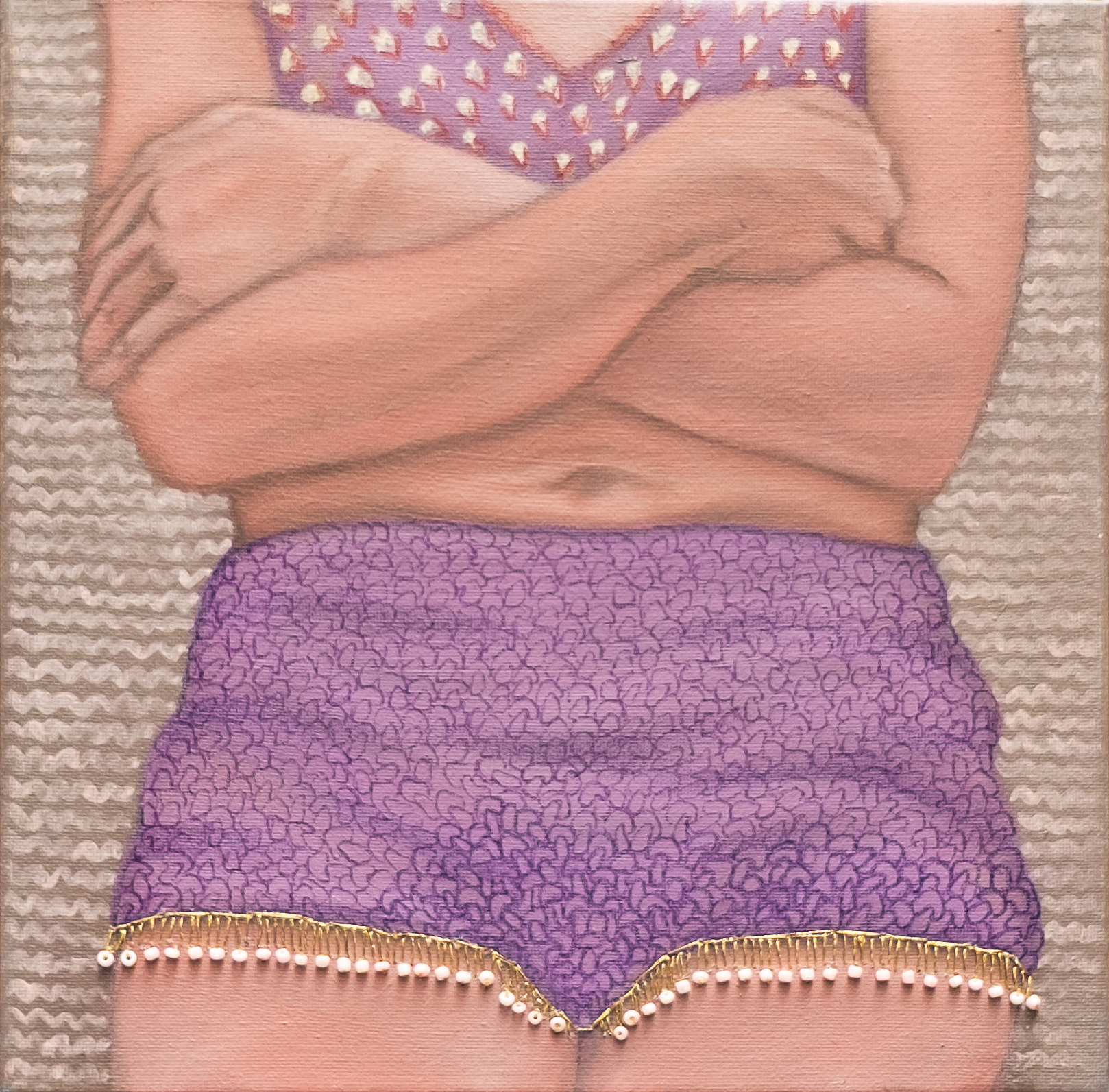 Guadalupe’s artistic language is rooted in a tactile and layered approach. She combines crayons, pencils, acrylics, and unconventional materials—paper, plastic fragments, bubble wrap, thread—into compositions that, when viewed from a distance, merge into a unified surface. This visual fusion evokes the memory of woven textiles, recalling the artisanal gestures and domestic knowledge historically associated with women. Her works function almost as contemporary tapestries, where stitching becomes both a structural and narrative device: at times constructing garments, at others delicately tracing details.