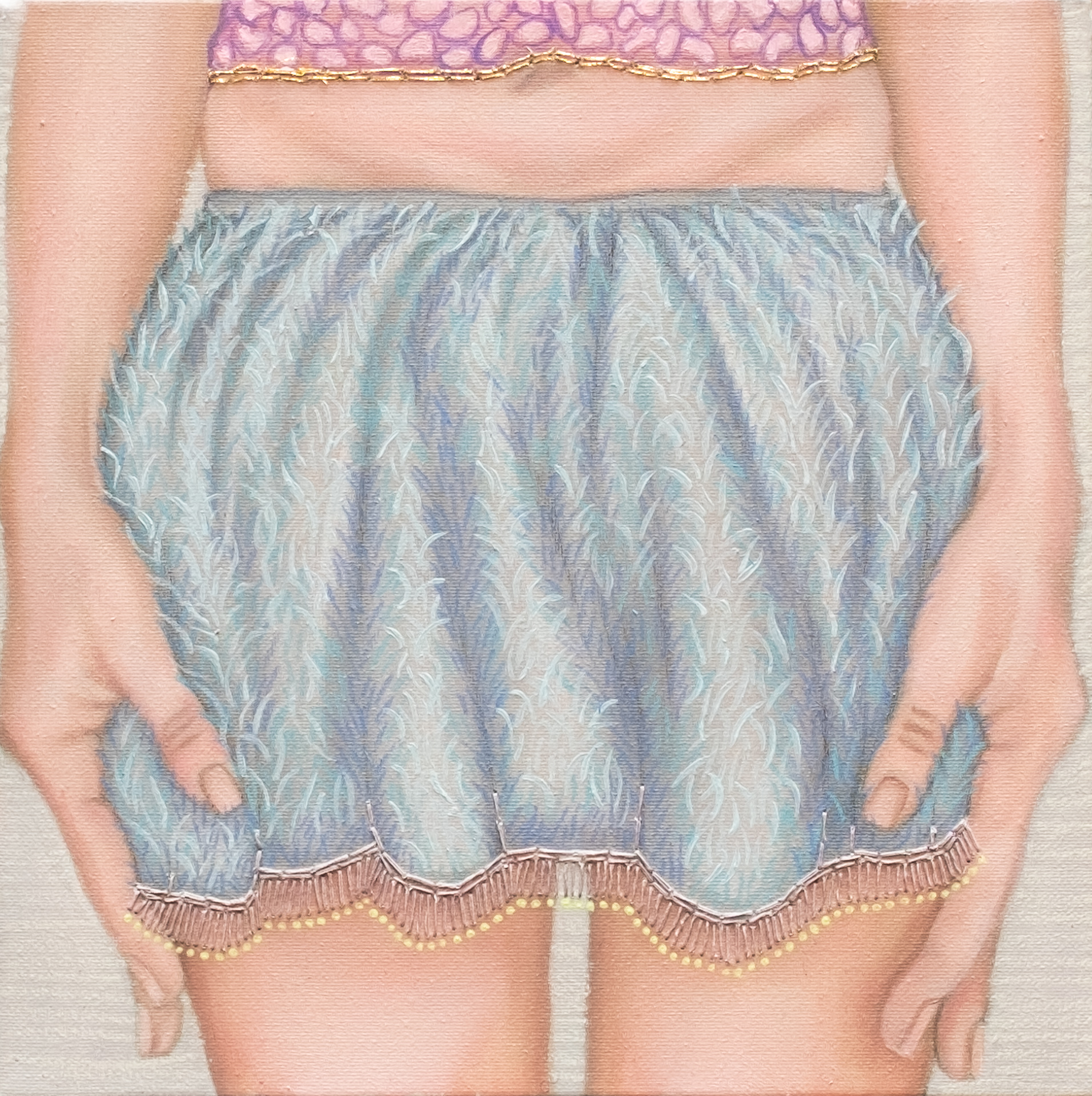 Her recent works, such as Il Palloncino (2026), explore the idea of ascent and spiritual search. Here, female figures are depicted in a state of elevation, suggesting a return to a primordial dimension and a quest for inner essence. The work’s luminous and precious quality reinforces this symbolic trajectory toward lightness and transcendence. In Disparte (2022), the focus shifts inward: the act of observing oneself becomes central, inviting reflection on behavioural patterns and emotional awareness. This introspective dimension speaks directly to contemporary concerns around identity, consciousness, and self-perception.